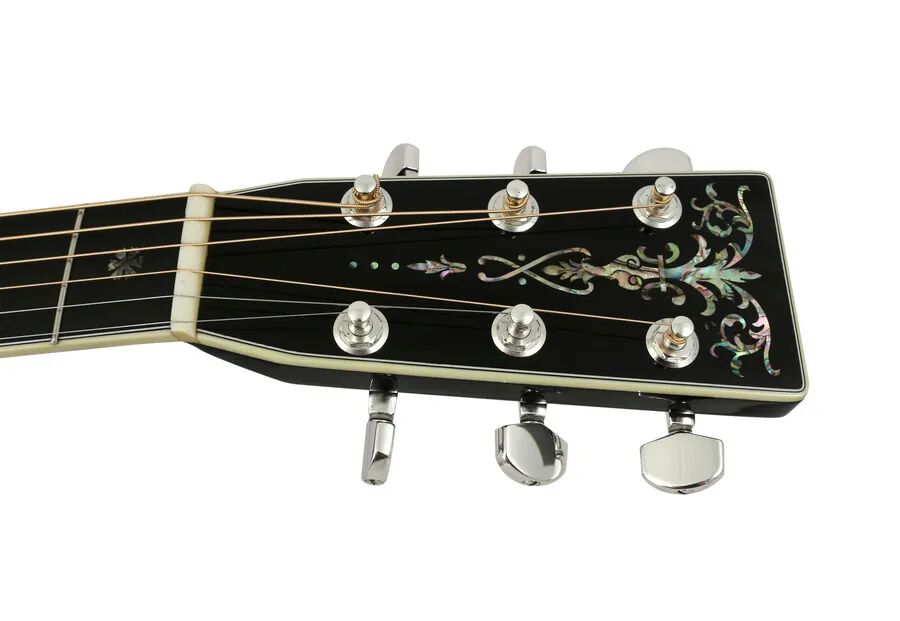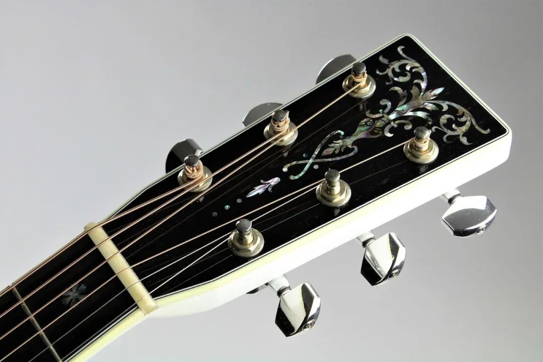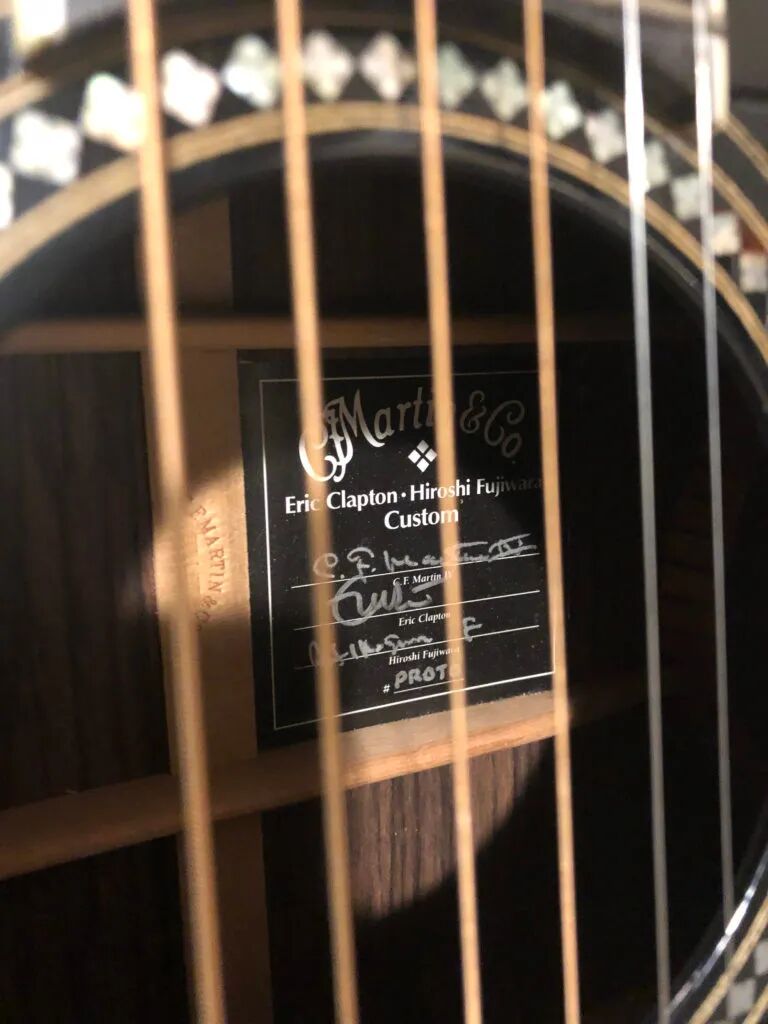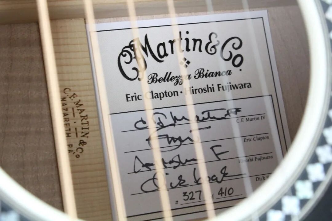 有一点需要说明的是,Eric本人使用的那一款和后来发行的存在一些差异。原来指板上“EC&HF”的镶嵌在后来的型号上换成了“Bellezza Nera”。另一个就是音孔圈的区别,最初版本音孔圈直接贯穿了整个指板,而后来的指板最后一品没有做处理。最后一个区别就是最初版本内部只有一个黑色的标签,有C.F.Martin IV,Eric和Hiroshi的签名,而后来的型号是一个黑白的标签,同时也增加了一个Dick Boak的签名。。